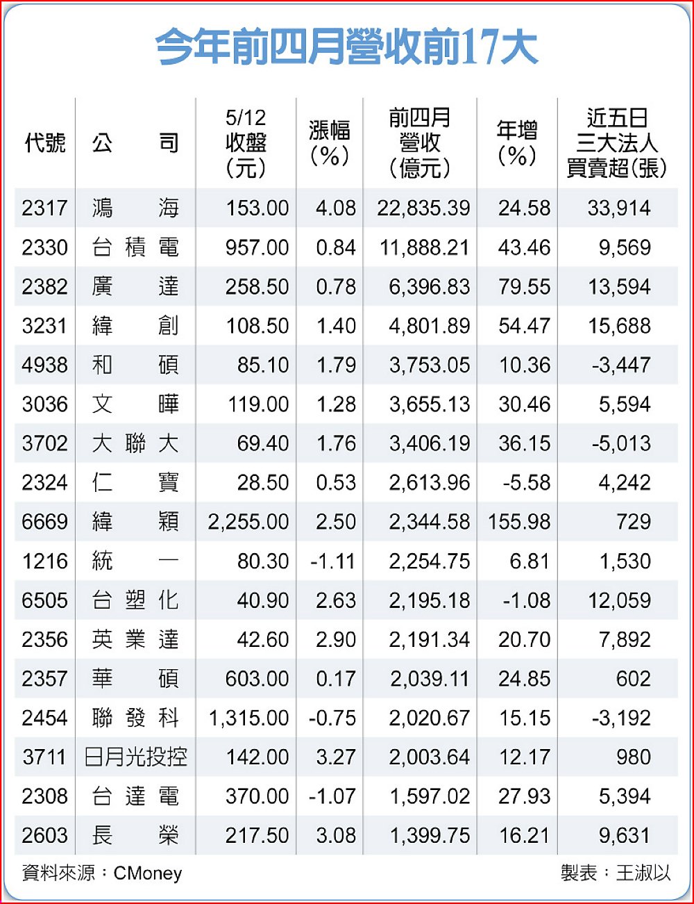台股上市櫃公司今年來前17大的公司分別是鴻海、台積電、廣達、緯創、和碩、文曄、大聯大、仁寶、緯穎、統一、台塑化、英業達、華碩、聯發科、日月光投控、台達電、長榮等,多數為電子股占比超過8成,僅有統一、台塑化及長榮為傳產股;對照去年前四月合併營收的前17大名單,亦可透露出目前產業的興衰趨勢,電子旺、傳產疲弱及併購潮。