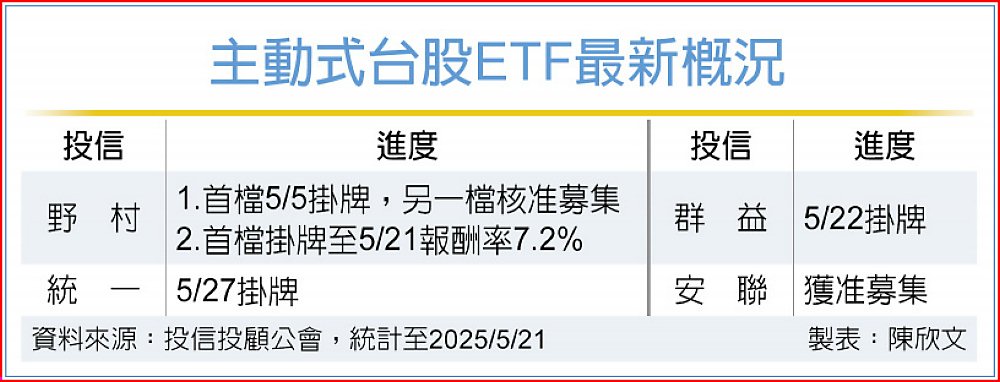 今年是主動式ETF元年,首批掛牌上市的主動式台股ETF募集期間,遭遇全球股市因關稅戰震盪,但隨著關稅戰趨緩,首檔野村台灣智慧優選主動式ETF(00980A)以14億元報請成立之後,市場傳出將在22日掛牌的群益主動式台股ETF募集近50億元、27日將掛牌的統一投信ETF也逼近30億元,預估將為台股增添活水,加上00980A掛牌後雖一度破發,但隨台股翻揚至今報酬率達7.2%,規模也增至超過20億元,加上安聯投信也將加入戰場,預期將使台股主動式ETF投資增溫。