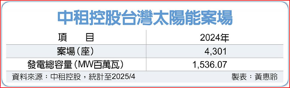 中租控股董事長陳鳳龍於法人說明會中提到,中租控股提升綠能資產營運效益,今年將積極推動綠電銷售與市場化。根據規劃,今年中租綠電銷售目標達2.5億度,若每度售價較原躉售電價提升約17%,將可為公司帶來約1.6億元額外營收,有助提升整體資產的報酬率與流動性。