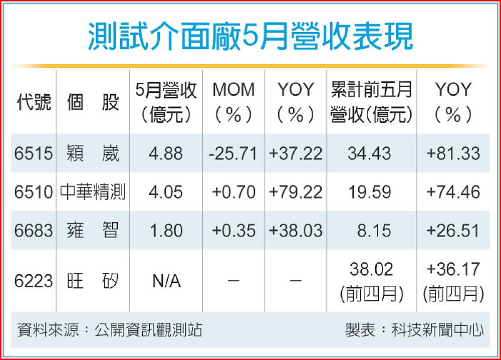 AI浪潮席捲全球,無論輝達的H100/B100系列GPU,或蘋果、特斯拉、亞馬遜、Google等自研AI加速晶片的需求暴增,都讓高效能運算(HPC)成為先進製程推進的核心動能。而在這場科技競賽中,不為大眾所熟知的測試介面產業正扮演至關重要的角色,並在AI晶片需求爆發下,迎來實質的長線紅利,台廠包括穎崴(6515)、旺矽(6223)、中華精測(6510)及雍智科技(6683),累計營收均有旺盛年增表現,營運可望在未來市場成長趨勢下受惠。