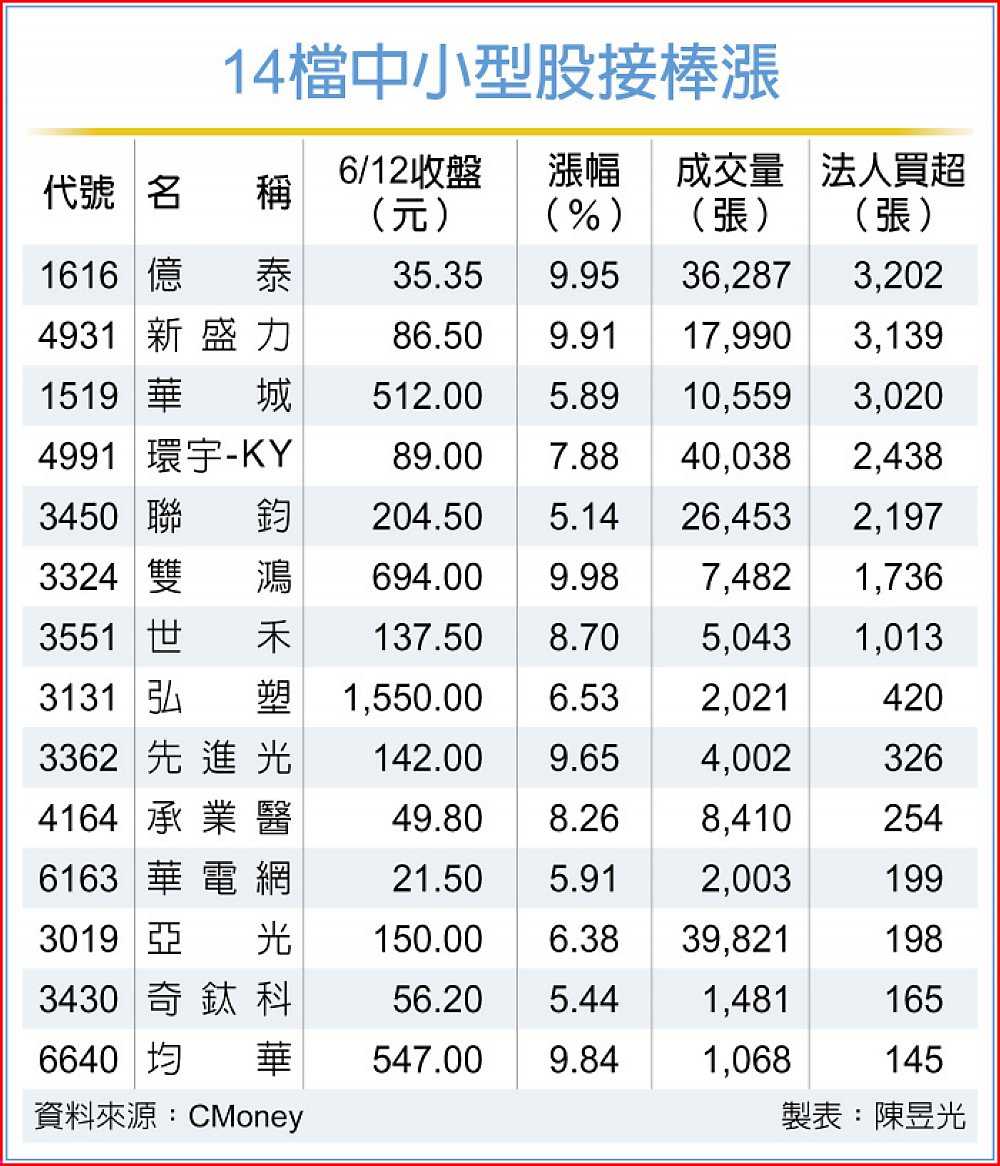 台股漲多回檔,權值股台積電、聯發科呈平盤之下震盪走勢,買盤湧入營收成長或具利多消息的中小型股,包括華經、合一、中天、億泰等全數亮燈漲停,櫃買指數12日上漲0.76點,收234.77點,表現強過大盤。
