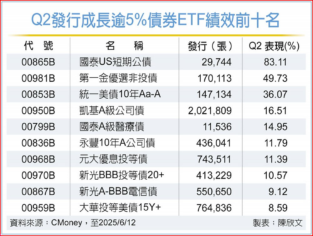 統計第二季以來發行張數成長率最高前五名,以短天期債券為主,前三名發行成長幅度最可觀,包括國泰US短期公債(00865B)83.11%、第一金優選非投債(00981B)49.73%,及統一美債10年Aa-A(00853B)36.07%;其中00981B將在6月19日進行月配除息,由於連續兩個月公告除息0.072元,按11日收盤價9.05元計算,年化配息率高達9.6%,也是吸引投資交易熱度大幅上升關鍵。