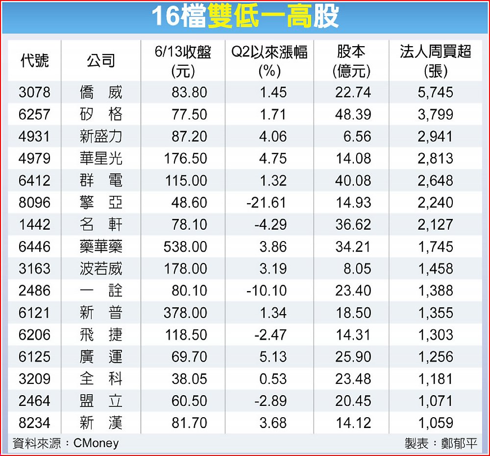 篩選股本小於50億元、本季來漲勢落後大盤、法人單周加碼逾1,000張之「雙低一高股」,共有僑威、矽格、新盛力、華星光、群電、擎亞、名軒、藥華藥、波若威、一詮、新普等16檔入列,法人單周買超張數介於1,059~5,745張,可以在台股盤整期間維繫多方人氣。