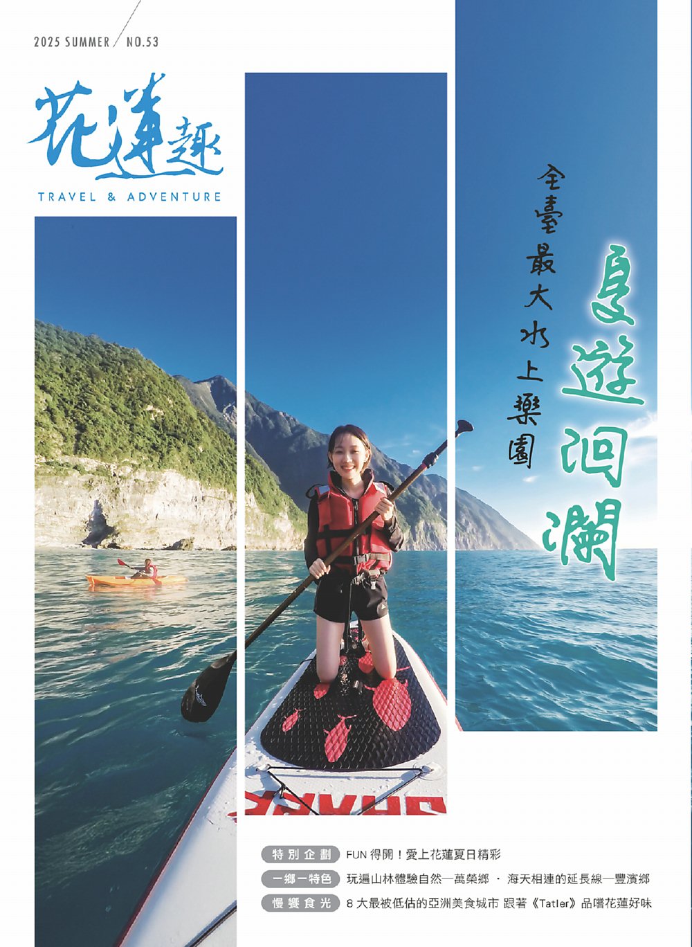 《花蓮趣》第53期夏季號出刊囉!國內外遊客訪花必備的花蓮觀光季刊《花蓮趣》,今(114)年夏季號聚焦報導花蓮成為「全臺最大水上樂園」,帶領旅人暑期暢遊花蓮各式各樣親水、近水、玩水的活動和景點,從花蓮外海巧遇鯨豚和海洋月光賞星,到壽豐鯉魚潭搭天鵝船漫遊湖光山色,以及「花蓮FUN暑假」活動享受5大水上遊憩設施,還有清水斷崖玩SUP立槳和獨木舟、秀姑巒溪激流泛舟、或是沿著山林清涼溪水溯溪,參與河上餐桌遊程,以及每年夏天大小朋友必去的知卡宣綠森林親水公園,花蓮夏日的陽光成為旅人親水暢玩的暖身前奏。