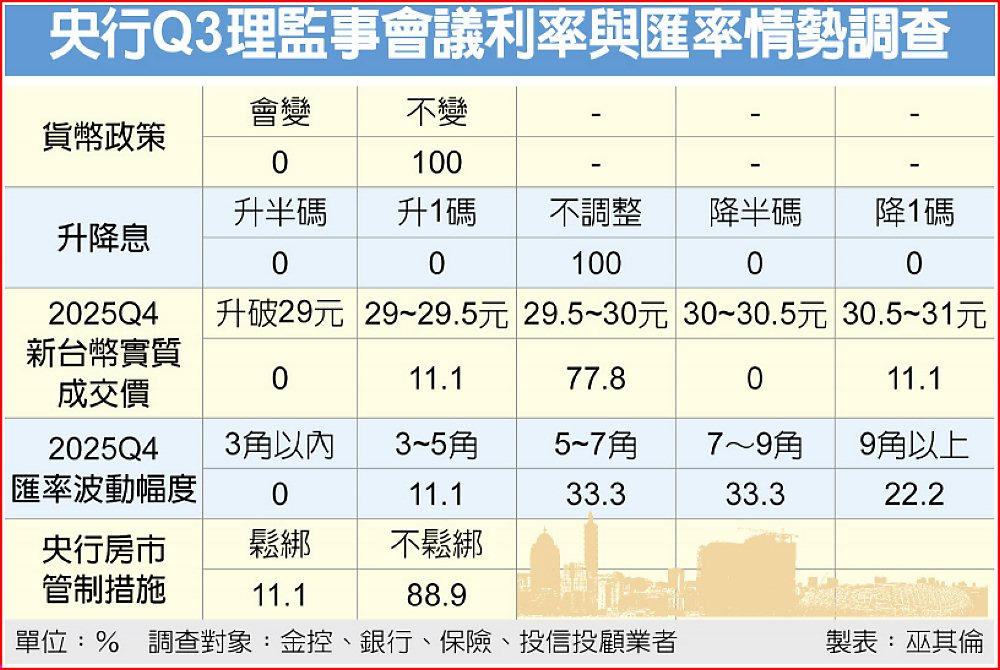 超級央行周登場,市場估計聯準會(Fed)本月重啟降息1碼(0.25個百分點),我央行18日召開第三季理監事會,據本報對金融業者問卷調查顯示,全數認為經濟成長尚屬穩健,且通膨下行趨勢不變、無通縮情況,降息迫切性低,央行本季先按兵不動,政策利率連六凍。但有業者認為,政策基調可能逐步走向寬鬆。