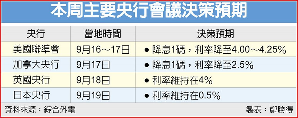 本周還有加拿大、英、日與台灣等逾十個國家央行都將公布貨幣決策,利率影響全球約五分之二經濟,涵蓋G7的四個國家,其中美、加料降息1碼,英、日料按兵不動。