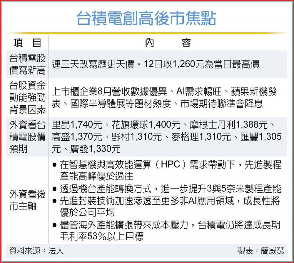 晶圓代工龍頭台積電一馬當先,連三天改寫歷史天價,12日收1,260元同時是當日最高價。外資圈人士判斷,對照各大外資券商賦予1,300~1,400元目標價區間,台積電股價尚有約1成潛在上檔空間,短線雖有漲多震盪可能,但也不排除外資樂觀目標價區間再度上移,進一步強化市場對台積電信心。
