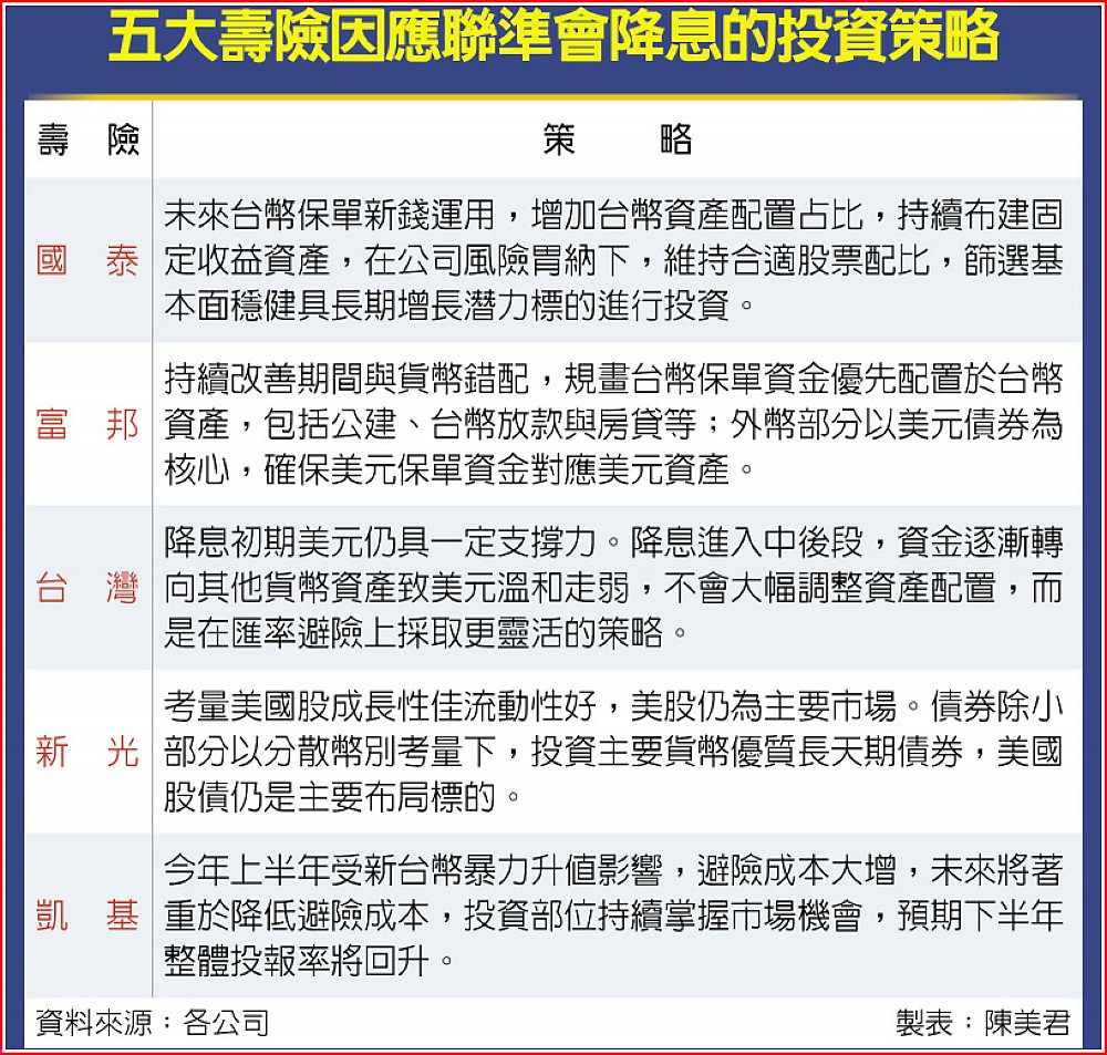 市場預期美國聯準會(Fed)本周將啟動新一波降息循環,五大壽險公司「準備好了」。國泰、富邦與台灣人壽均表示,因應聯準會降息,將提升新台幣資產配置;五大壽險同步強調,下半年匯率風險將是財務操作一大重點。