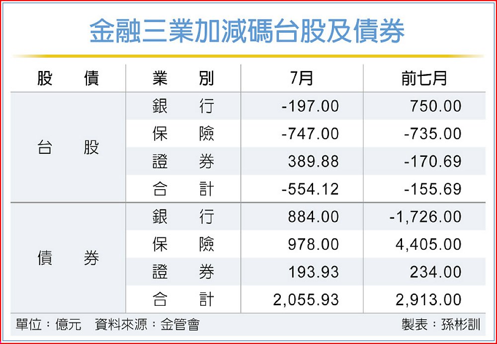 全球股市7月持續反彈,但金融三業操作不同調,7月金融三業合計對台股減碼554.12億元,前七月對台股減碼155.69億元,主要是保險業7月擴大減碼747億元,銀行業也趁高檔順勢減碼197億元,僅證券業逆向加碼389.88億元。