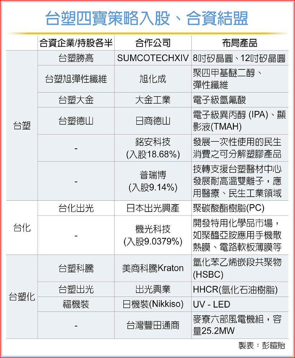 因應半導體、AI及生技產業跨界利基應用升級趨勢,台塑四寶利基轉型大出招,一改過往獨資、產能一貫布局的考量思維,加速啟動策略結盟合資、增資入股模式,凝聚創新開發能量。