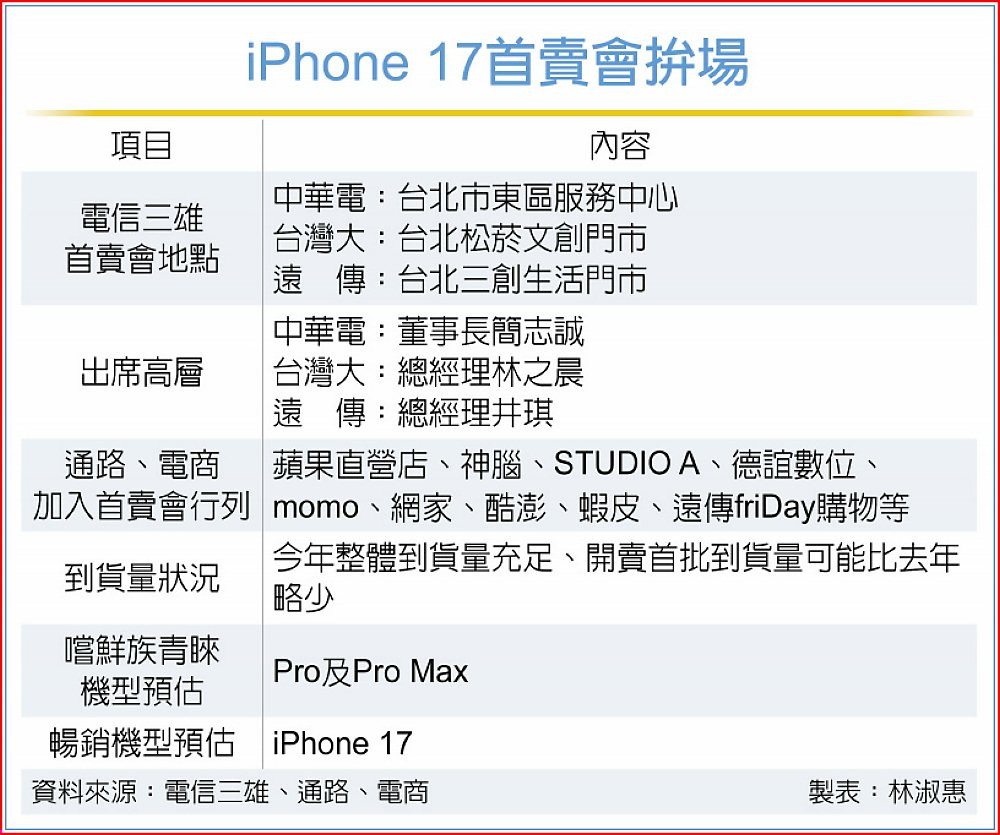 iPhone 17新機將在19日於全球開賣,主導台灣7成iPhone年度銷售量的電信三雄,今年一如以往高規格寵果粉。中華電信董事長簡志誠、台灣大總經理林之晨、及遠傳總經理井琪將親自站台「圈粉」,拚人氣更拚買氣。