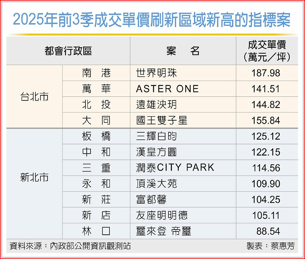 今年以來,雙北市至少有15個行政區成交單價再度改寫前高,且蛋白區甚至緊追蛋黃區。南港世界明珠每坪最高單價達187.98萬元,再破前高;遠雄泱玥每坪達144.82萬元改寫北投新高;國王雙子星155.84萬元、ASTER ONE達141.51萬元,分別突破大同、萬華區新高,也直逼信義、松山、中正等蛋黃區。