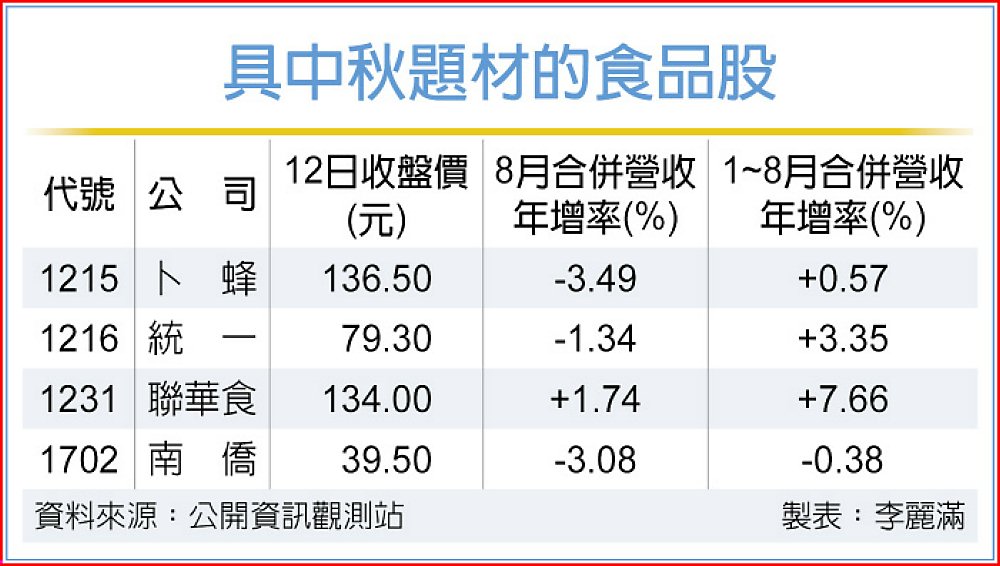中元檔期不夠旺,食品業者緊盯接下來的中秋檔期,包括大成(1210)、卜蜂(1215)、統一(1216)、聯華食(1231)、南僑(1702)等,積極備戰,推出肉、飲品與休閒零食等禮盒搶攻買氣,期待10月中秋送禮商機爆發推升業績,逆轉消費市場頹勢。