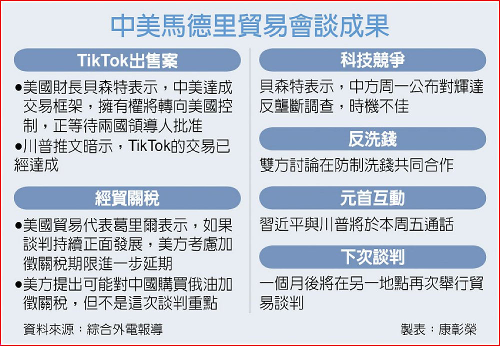 美國總統川普同日在社群平台Truth Social發文:「中美雙方就一家『特定』公司達成協議,這家公司是我國年輕人非常希望保留下來的。這會讓他們非常高興!」貝森特在中美會談結束後透露,此次談判重點是TikTok,而非貿易協議。雙方已就TikTok交易案達成框架協議。