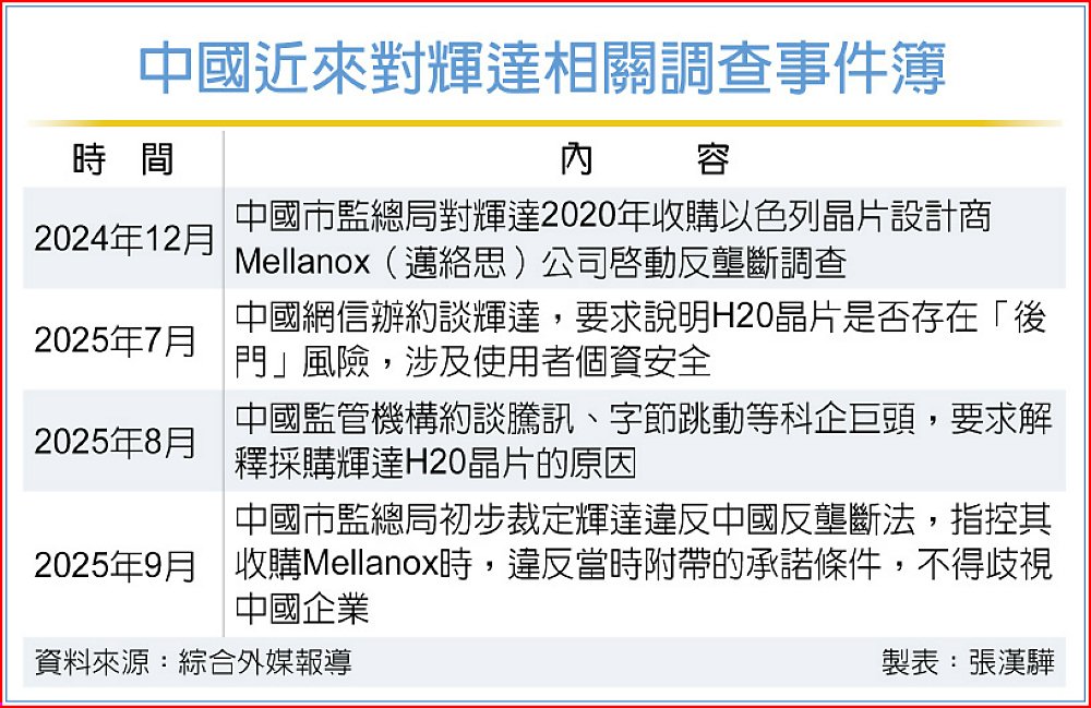 綜合外電報導,中國市監總局指控輝達在收購以色列晶片設計商Mellanox Technologies時,違反當時附帶的承諾條件,包括在中國市場銷售輝達GPU加速器與邁絡思高速網路互聯設備時,不得以任何方式強制進行搭售等七個要件,亦即不得歧視中國企業。經初步調查,確定存在違法行為,但市監總局未公布具體細節,僅強調將依法對輝達展開進一步調查。