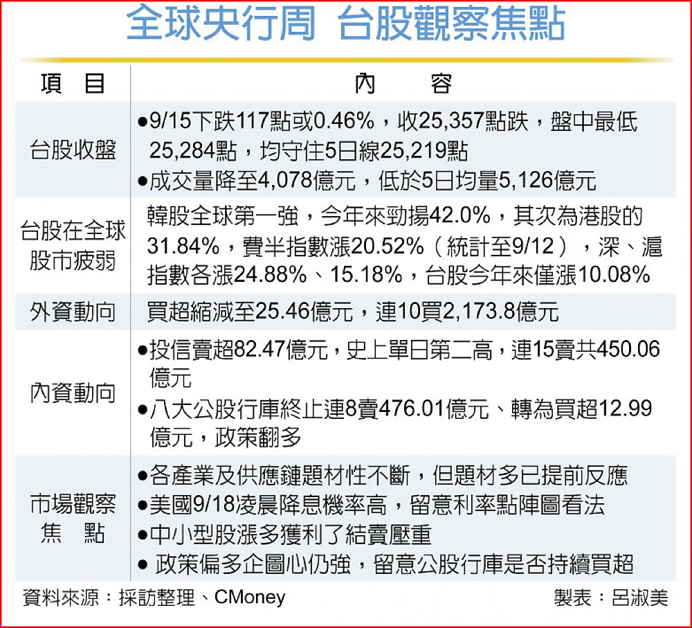 台新投顧副總經理黃文清則認為,美國18日凌晨將宣布降息,目前估計應為1碼,2碼的機率不高,而航太展、蘋概股題材等,市場也多已提前反應,盤面上許多中小型股更出現獲利了結賣壓、明顯回檔,因此,建議保守操作。
