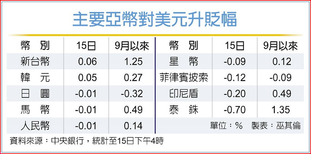 美國就業數據疲弱,市場篤定聯準會本周降息,推升美股表現,但周四答案揭曉前,短線明顯趨觀望,新台幣15日最終收在30.228元、僅小升1.8分,總成量縮小至13.975億美元。匯銀主管指出,早盤匯市交投冷清,大部分客戶及銀行都在等聯準會開會結果,僅有軍購款匯出買美元,使新台幣早盤小幅走跌,但午盤起特定美系外資持續卡位布局台股、轉為匯入,且由於整體市場量能清淡,外資熱錢回流馬上拉升新台幣,行情立刻由貶轉升。