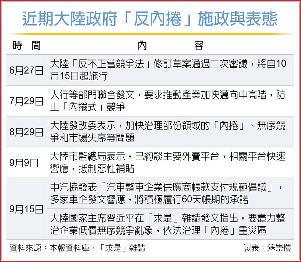 大陸國家主席習近平7月1日主持召開中共中央財經委員會第六次會議,會議指出,縱深推進全國統一大市場建設,依法依規治理企業低價無序競爭,釋出官方「反內捲」的信號。大陸官媒「求是」雜誌9月16日刊登習近平署名文章,再次強調推動落後產能有序退出。