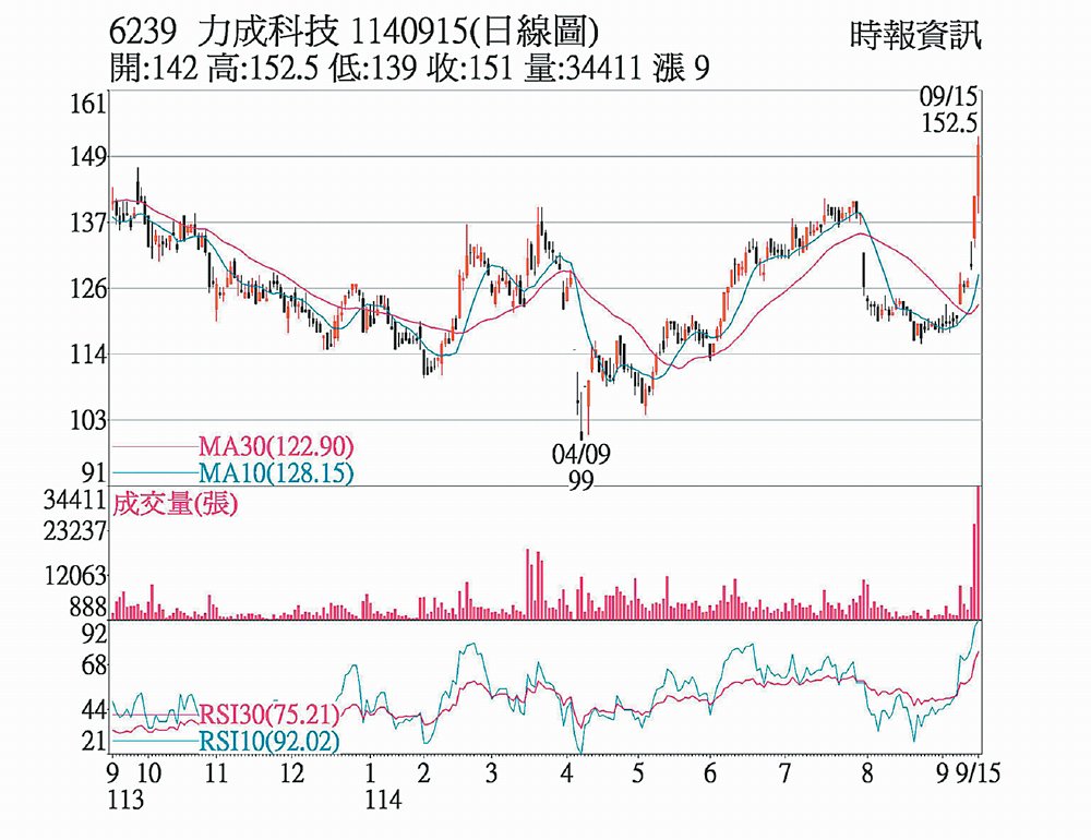 力成(6239)15日收在151元,漲幅6.34%,成交量大幅放大至3.4萬張,股價續創下波段新高。從短期技術線來看,5日線、月線、季線、半年線均呈現向上排列,顯示短多動能強勁。股價已站穩周線與月線,MACD、RSI等指標同步偏多,波段趨勢結構重啟。