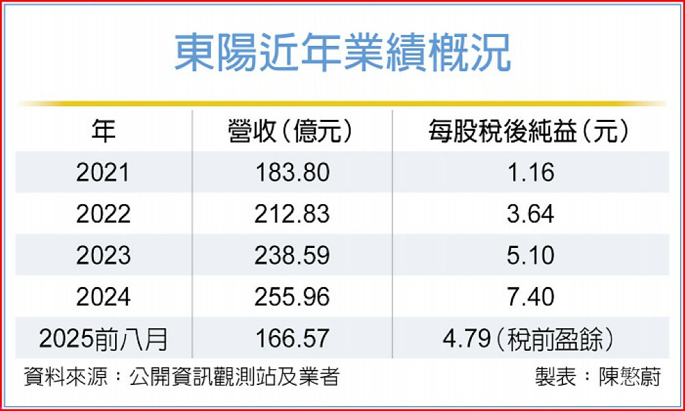 東陽獲利雖連續四個月受匯率侵蝕,使得前八月獲利低於去年,但若排除兩期匯率因素,前八月獲利反而優於去年同期,顯示本業體質穩健。法人解讀,東陽第二季受到「關稅、匯率雙殺」影響的利空正逐步淡化。