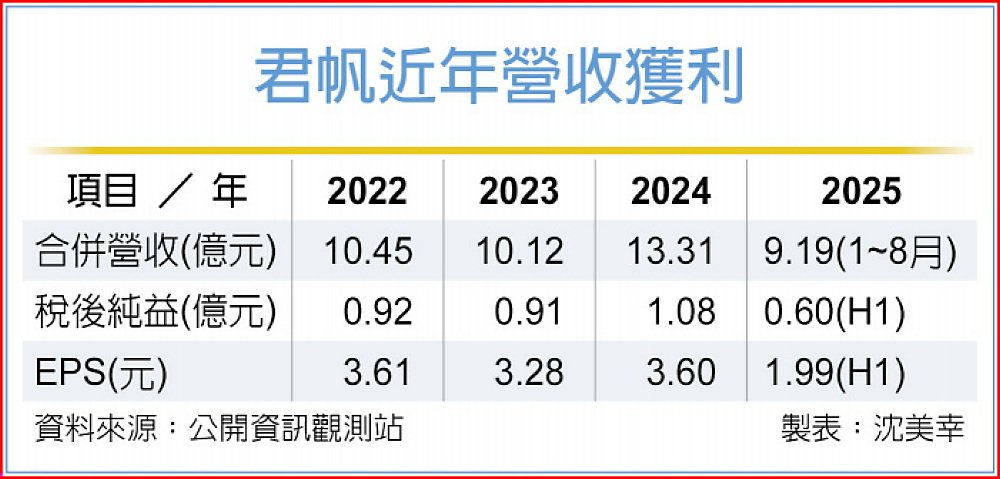 對等關稅衝擊,君帆(4584)因部分客戶外銷美國受影響,下單也放緩,君帆估9月、第三季營運將持平去年同期。君帆表示,透過提振涵蓋半導體在內的電子設備銷售,力拚全年獲利優於去年,營收挑戰新高。