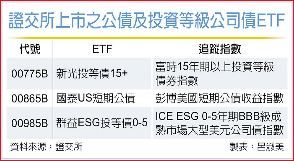 證交所現有相關上市債券ETF,包含群益ESG投等債0-5(00985B)鎖定短天期美元投資等級公司債,並加入ESG篩選因子;新光投等債15+(00775B)聚焦於長天期美元投資等級公司債,債券發行人涵蓋消費、能源、電信、銀行和保險等產業;國泰US短期公債(00865B)主要投資標的為美國政府發行之債券,且平均年期低於一年。