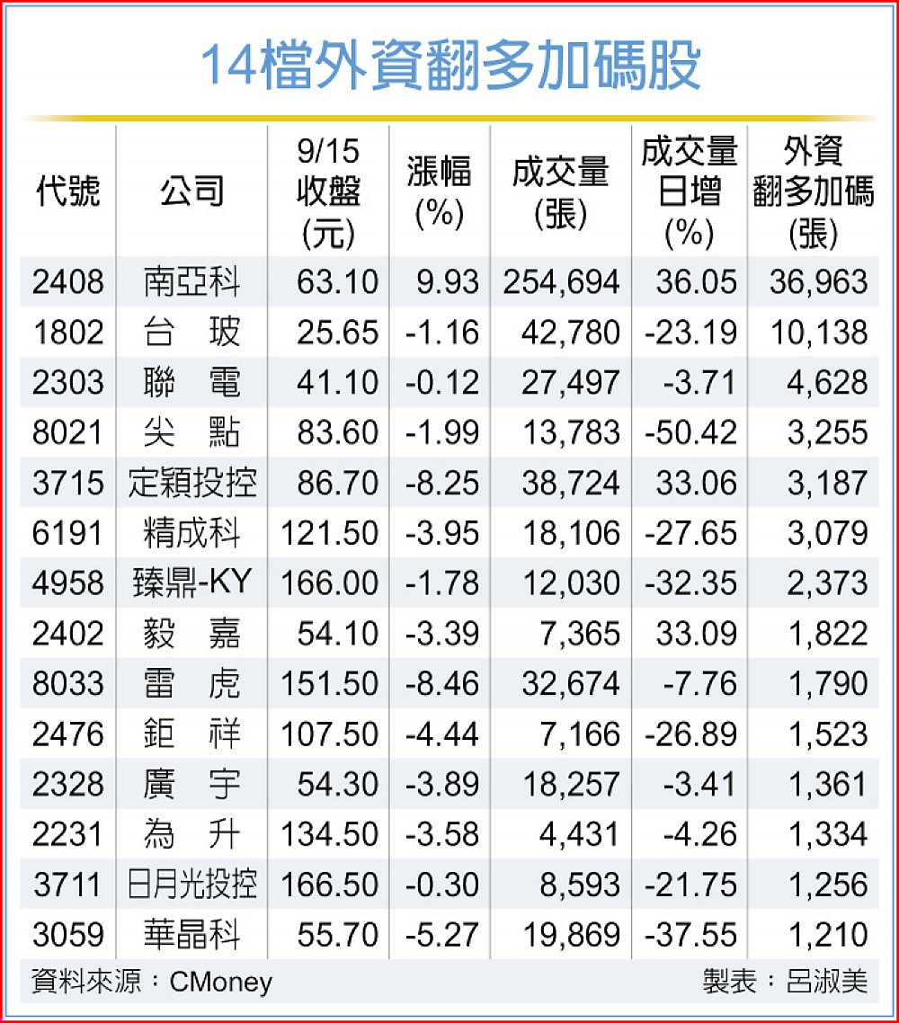 外資寫下連十日買超台股,累計加碼約2,173億元,然而外資15日對台股買超驟減至25億餘元,顯示當前對台股操作偏保守,不過,外資仍對特定個股翻多,隨著股市來到25,000點高檔,且指數開始出現高檔震盪,隨時都有拉回的壓力下,外資此時翻多敲進的個股值得留意。據統計,上周五之前,外資站在賣超或連續賣超,但15日翻多加碼1,200張以上有14檔上市股,包括南亞科、台玻、聯電、尖點、定穎投控、精成科、臻鼎-KY、毅嘉、雷虎、鉅祥、廣宇、為升、日月光投控、華晶科等。從上述外資回頭敲進千張個股中來看,多集中電子股,就產業來看,以PCB族群居最大宗,另也加碼半導體股及軍工概念股等。