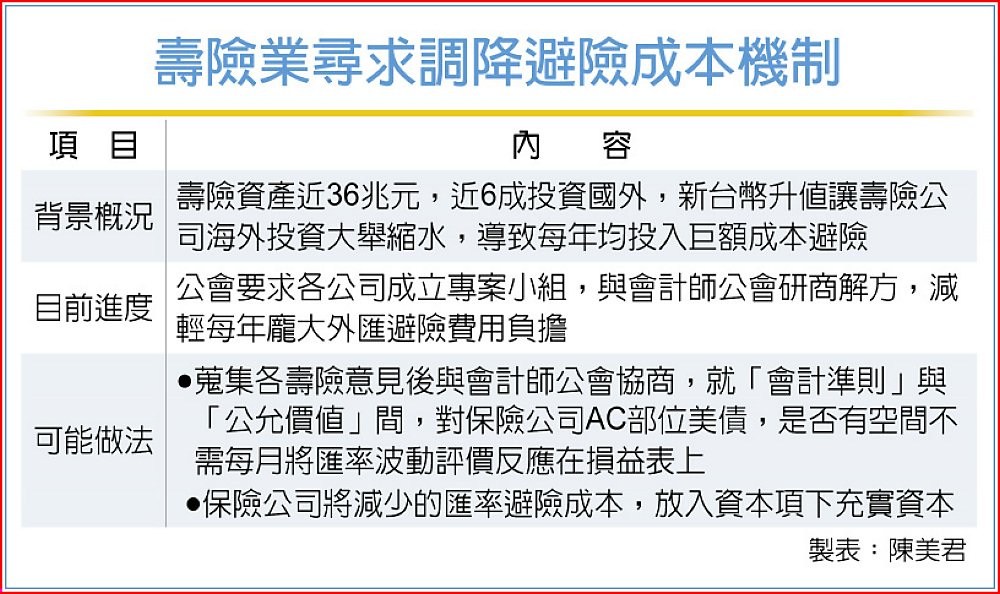 壽險業者透露,壽險公會近期將成立外匯專案小組,具體做法是,蒐集各壽險公司的意見後,會與會計師公會協商,就「會計準則」與「公允價值」間,對於保險公司的AC(按攤銷後成本衡量之金融資產,可視為持有至到期)部位的美債(台幣負債,美元資產),是否有空間,讓壽險公司不需每月將匯率波動的評價反應在損益表上,並讓保險公司可將減少的匯率避險成本,放入資本項下用以充實資本。但最終仍須經金管會同意。