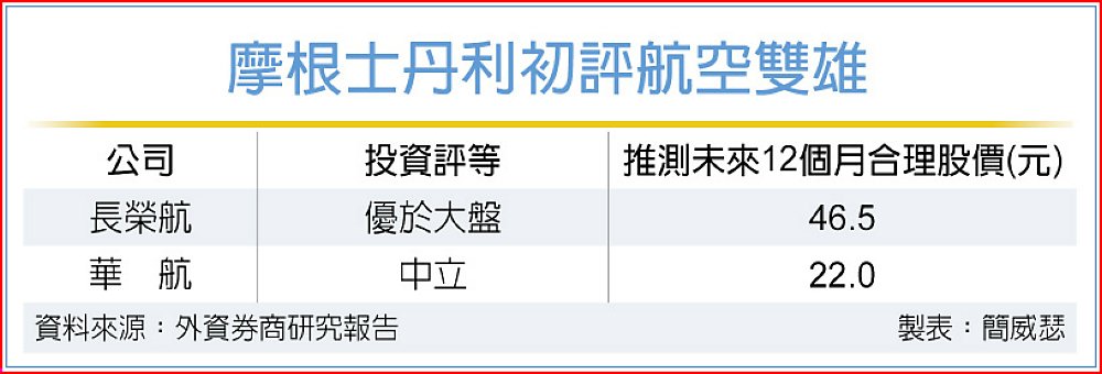 摩根士丹利證券指出,台灣航空股今年來股價表現疲弱,已反映宏觀經濟不確定性,展望未來9~12個月,在營收穩定成長與毛利率擴張帶動下,股價具補漲潛力;首度將航空雙雄納入研究範圍,看好長榮航空更受惠於客運復甦需求,給予「買進」投資評等、推測合理股價46.5元,華航則是「中立」。