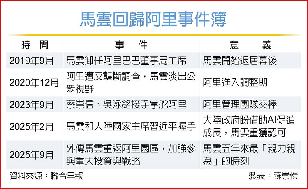 雖然目前還不清楚馬雲的回歸,是否已獲大陸政府高層點頭,但2025年2月其與大陸國家主席習近平握手,被視為大陸政府希望借助AI促進成長之際,馬雲重獲認可。