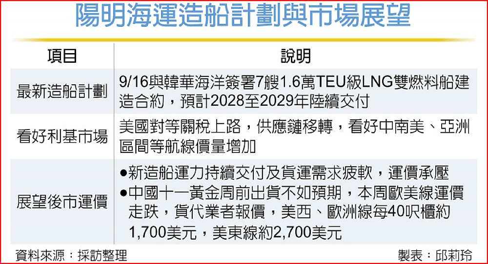 今年陽明預期訂造新船目標13艘,除了7艘1.6萬TEU級LNG雙燃料全貨櫃輪,還有6艘8,000TEU級甲醇雙燃料預置全貨櫃船,將與日本造船廠簽約,包括建造中的3艘、新造3艘,預計2028年~2030年陸續交船。總計13艘船投資金額約610億~680億元。