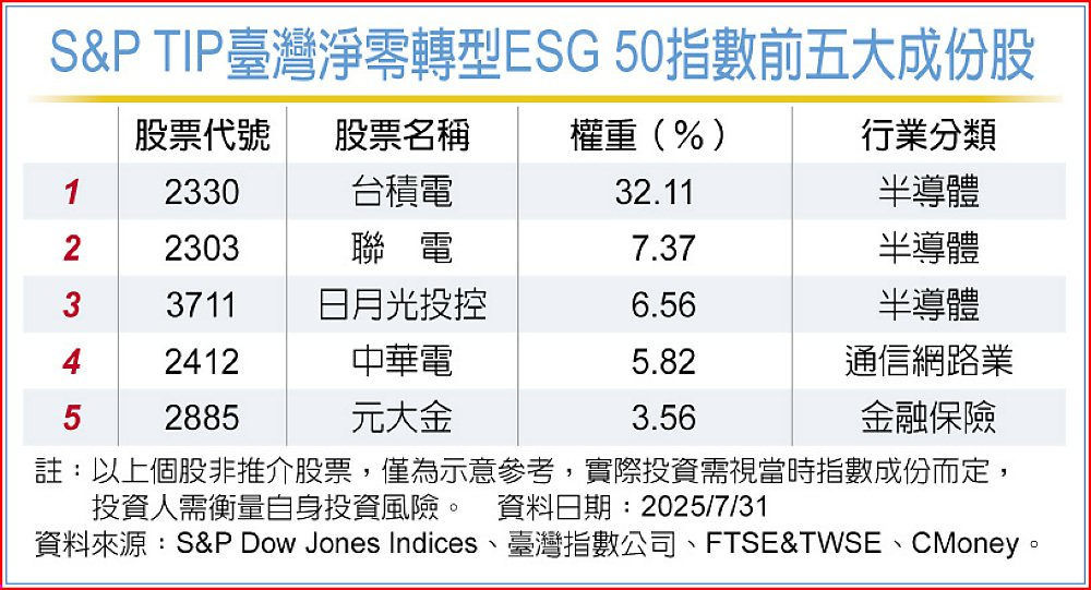 009809追蹤的「S&P TIP臺灣淨零轉型ESG 50指數」,以中大型上市公司為選股範疇,排除具爭議性產業與違反聯合國全球盟約的企業,並導入多項氣候風險衡量指標,包含溫室氣體排放量、符合歐盟巴黎協定(PAB)及氣候轉型(CTB)標準之7%脫碳軌跡,及高氣候影響行業收入比例、ESG分數等多項氣候指標,最後選取50檔成份股。