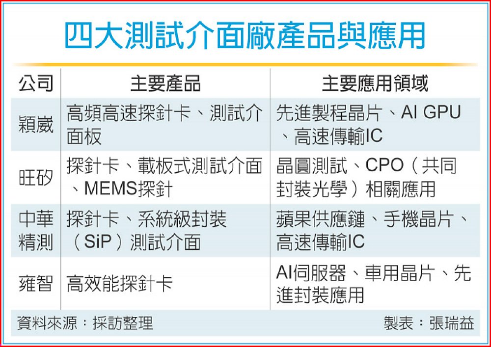 法人指出,晶片微縮、異質整合加速,測試介面需求已成為產業鏈不可或缺的環節,台股四大測試介面廠穎崴(6515)、旺矽(6223)、中華精測(6510)、雍智(6683)今年營運全面上揚,展望2026年,半導體規格不斷提升,測試動能維持強勁,明年業績仍有機會持續攀升。