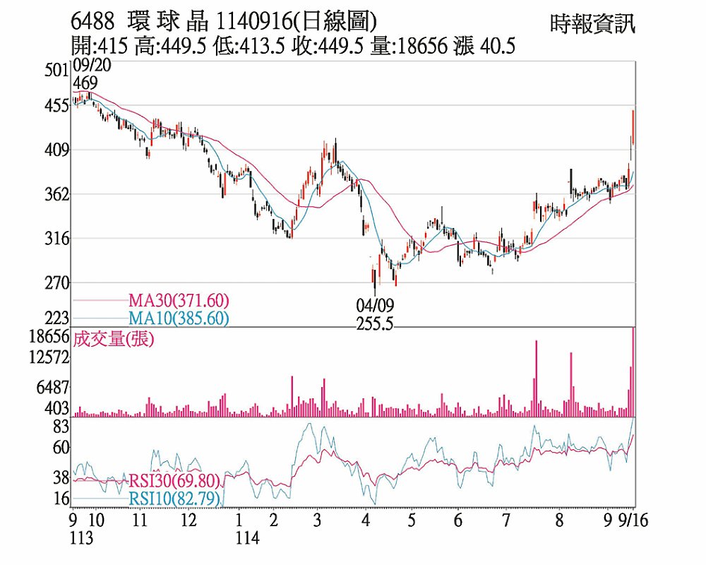 環球晶(6488)16日以415元開出後一路走揚,終場收在漲停價449.5元,大漲40.5元,創今年以來波段新高。三大法人同步加碼,合計買超3,355張,顯示市場法人對公司中長期成長動能看好。