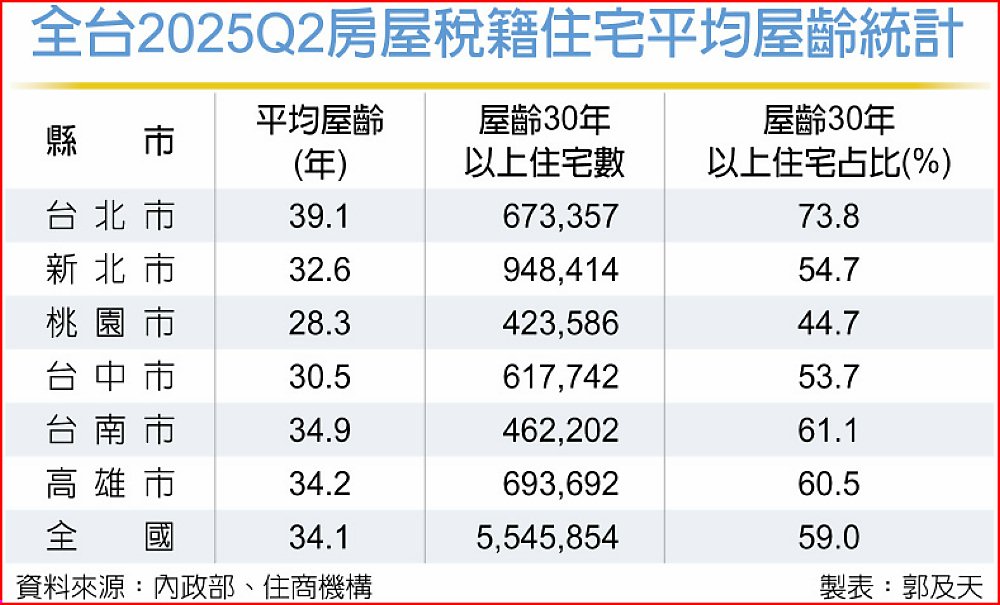 統計顯示,全台各縣市中除澎、雲林、嘉義縣平均屋齡超過40年,台北市39.1年,此外如南投、屏東、台東、花蓮等縣市也都逼近39年,全台房屋最年輕的是桃園市28.3年,全台也僅有桃園、新竹縣市及金門縣四個縣市平均未及30年。