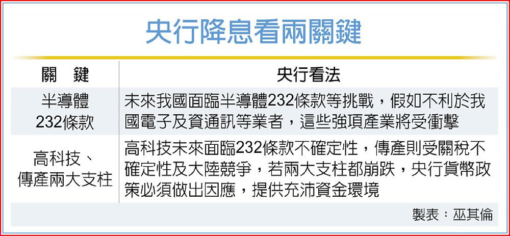 中央銀行18日宣布政策利率按兵不動,至今已「連六凍」。央行總裁楊金龍強調,當前貨幣政策是「適度讓資金充裕」,而是否跟進降息,未來仍要看數據說話(data dependent),主要關注兩大關鍵,一是半導體232條款結果是否對台灣高科技業不利,二是高科技產業與傳產兩大支柱同步衰退時,「貨幣政策就必須要做些因應」。