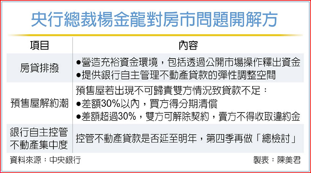 市場傳出預售屋購屋者貸款不足爭議,楊金龍強調,預售屋買賣和購屋貸款契約是兩種不同契約,貸款不足時應透過內政部的預售屋定型化契約辦理,若出現不可歸責雙方情況導致貸款不足,差額在30%以內者,買方得分期清償,差額超過30%,買賣雙方亦可解除契約,且賣方不得收取違約金,央行實施選擇性信用管制就屬於不可歸責事項,賣方不可以沒收買方的違約金,「預售屋解約原因眾多,並非全因交屋貸款不足因素所致,還包括買受人換戶、個人資金不足等」。