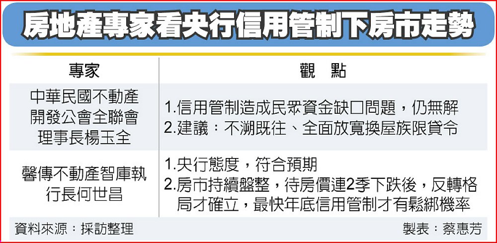 中央銀行理監事會議維持房市管制措施不變,房地產業者指出,符合房產業界預期,也因此房價尚未確立反轉格局,央行給房市的Lesson也還沒下課,最快年底才有鬆綁空間、慢則要明年第一季,預期房市難脫價量修正格局,要有長期抗戰的準備。