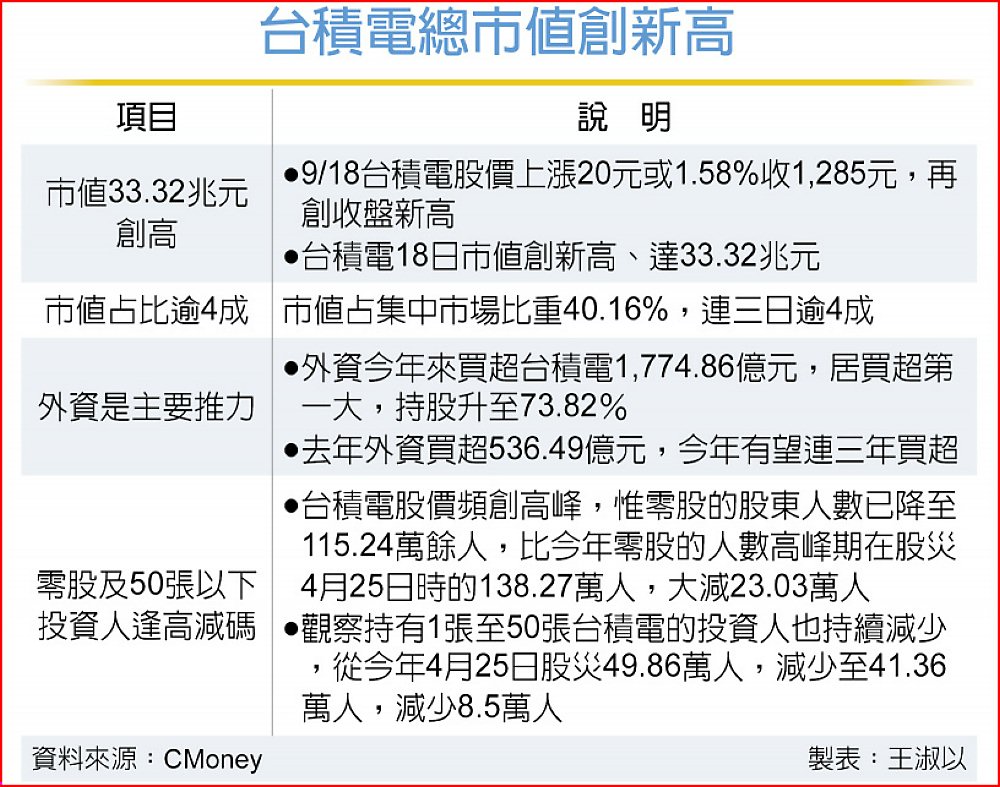 AI夯!外資今年來買超台股權王台積電1,774億元,激勵台積電再度締造歷史新猷,18日股價上漲20元收高1,285元,創下歷史收盤新高,市值同步衝上33.32兆元,占上市總市值比重達40.16%,已連續第三個交易日穩居「4成俱樂部」,顯示台積電對大盤的影響力正與日俱增,呈現一檔獨大。