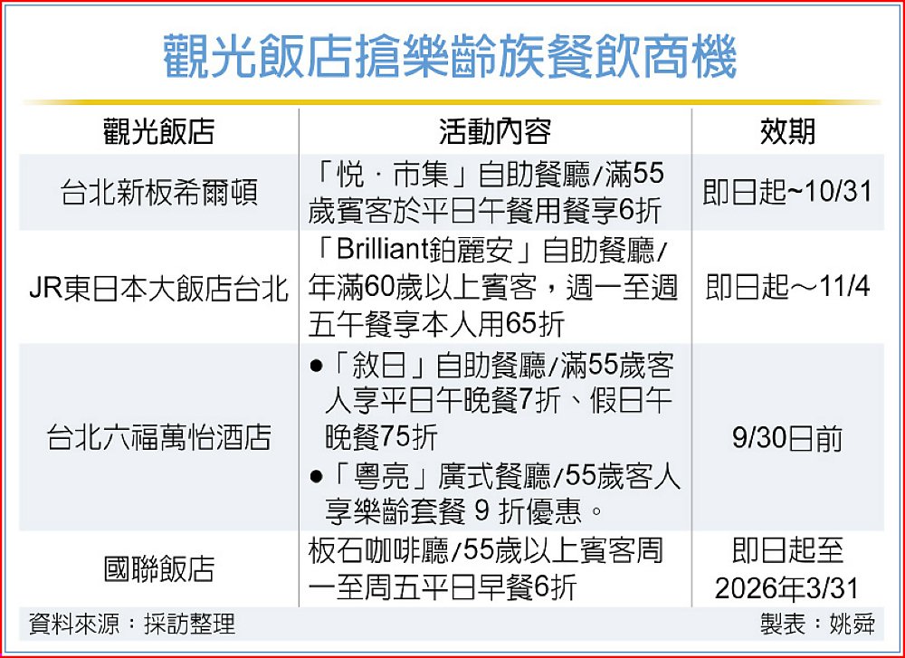 看好「樂齡族」消費力,並搶攻9月下旬起至10月的外食餐飲消費商機,台北新板希爾頓、JR東日本大飯店台北、台北六福萬怡酒店、台北國聯飯店,紛紛鎖定55歲以上樂齡族,在館內餐廳推出平日用餐專屬優惠,折扣自6至7折不等,期能串連各波段連假,衝刺餐飲業績,掀起「樂齡餐飲促銷大戰」。