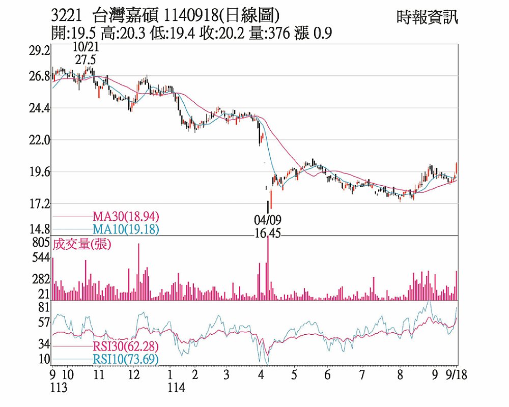 頻率元件類股18日同步走高,台嘉碩(3221)在買盤進駐下價量齊揚,早盤以19.5元開高後終場收在20.2元,漲幅4.66%,放量突破前高壓力區,醞釀續戰波段高點。