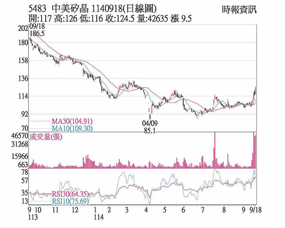 矽晶圓族群大漲,子公司環球晶(6488)飆上漲停,中美晶(5483)母以子貴,股價也爆量大漲,盤中一度觸及漲停,終場大漲8.26%作收,收盤價124.5元,成交量逾4.2萬張。