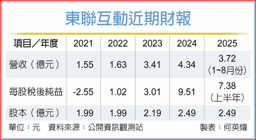 東聯互動前八月營收3.72億元,年增31.33%,上半年稅後純益1.83億元,年增61.9%,累計上半年每股稅後純益7.38元,優於去年同期的4.6元。該公司2024年每股稅後純益達9.51元,法人預期2025年應可順利賺一股本。