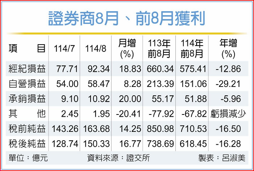 證券商8月獲利衝上150.33億元、月增16.77%,創下歷史單月新高新紀錄;而8月獲利年增更強勁,較去年8月的77.84億元,年增翻倍。