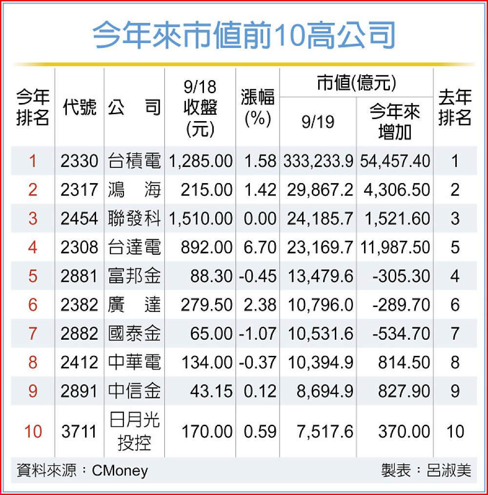 此外,鴻海今年來市值大增4,306.5億元、增加金額居第三名,如今市值逼近2.99兆元,穩居市值二哥,鴻海19日市值蓄勢戰3兆元大關;台光電今年來股價飆漲,帶動市值大增2,604.5億元,因而市值排名才能大躍進。