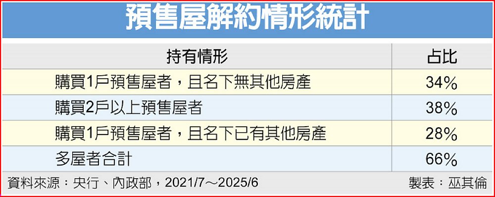 根據統計,解約案買受人購買2戶以上預售屋者占解約人數的38%,購買1戶預售屋者名下已有其他房屋占解約人數的28%,合計多屋者占比達到66%,顯示解約大多非屬自住需求者。