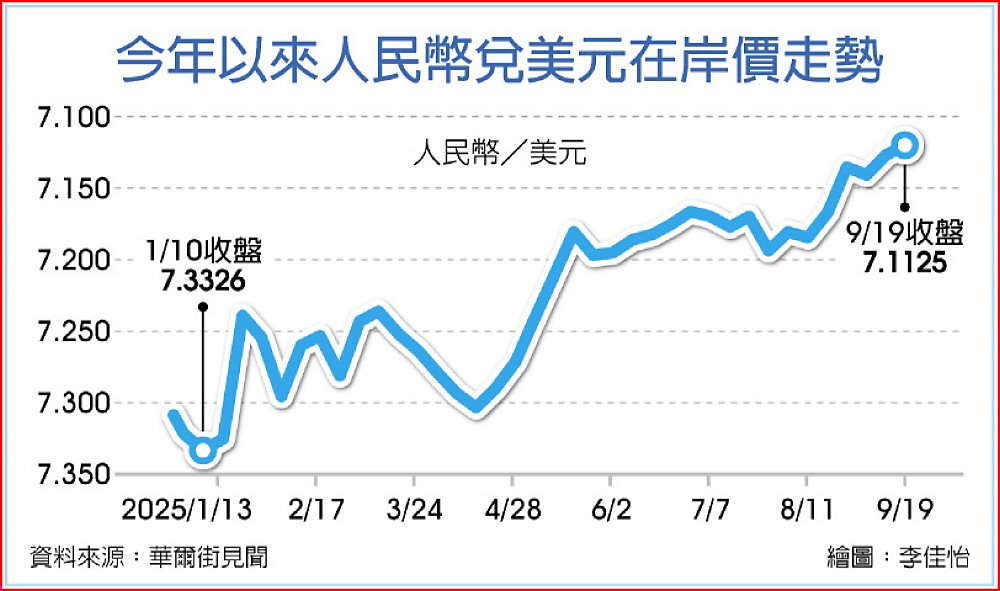 美國聯準會正式啟動降息周期後,美元指數走弱,人民幣兌美元匯價因此被動升值。因大陸出口商手中仍有龐大美元部位尚未結匯,加上近期外資積極布局陸股,兩大因素或將推升人民幣加速升值,有望升破整數7元大關。