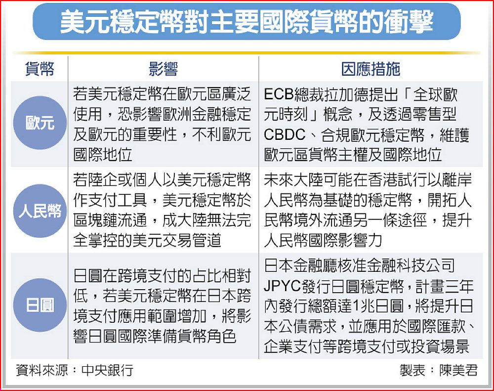 央行指出,目前全球第二大準備貨幣的歐元,在跨境支付中占比遠低於美元。歐洲央行顧問沙夫指出,若美元穩定幣在歐元區廣泛使用,恐影響歐洲金融穩定及歐元的重要性,歐洲央行總裁拉加德也提出「全球歐元時刻」概念,強調歐元區需強化政治可信度、經濟韌性及法律與制度完整性,增強在國際貨幣體系的角色。同時透過零售型CBDC、合規的歐元穩定幣、以分散式帳本技術(DLT)改善跨境支付等方式,因應美元穩定幣的興起。