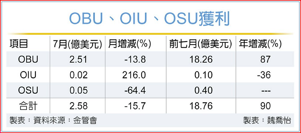 7月三大境外金融中心賺2.58億美元,月減15.7%,其中OBU賺2.51億美元、月減13.8%,OIU賺0.02億美元、月增翻二倍,OSU月減達64%;前七月來看,OBU獲利大躍進仍是主力。銀行局副局長張嘉魁表示,目前開辦OBU的家數達59家,本國銀行35家、外銀24家,7月賺新台幣74.9億元、月減9.7億元,原因是投資淨收益的減少,因為7月美對等關稅不確定性增加、債券殖利率上彈,導致銀行在債券的評價損失增加;前七月則賺546億元、年增達224.9億元,主要是市場對降息預期增溫,資金成本下降,及外幣定存費用與規模同步降低,利息費用減少,推升整體獲利表現。