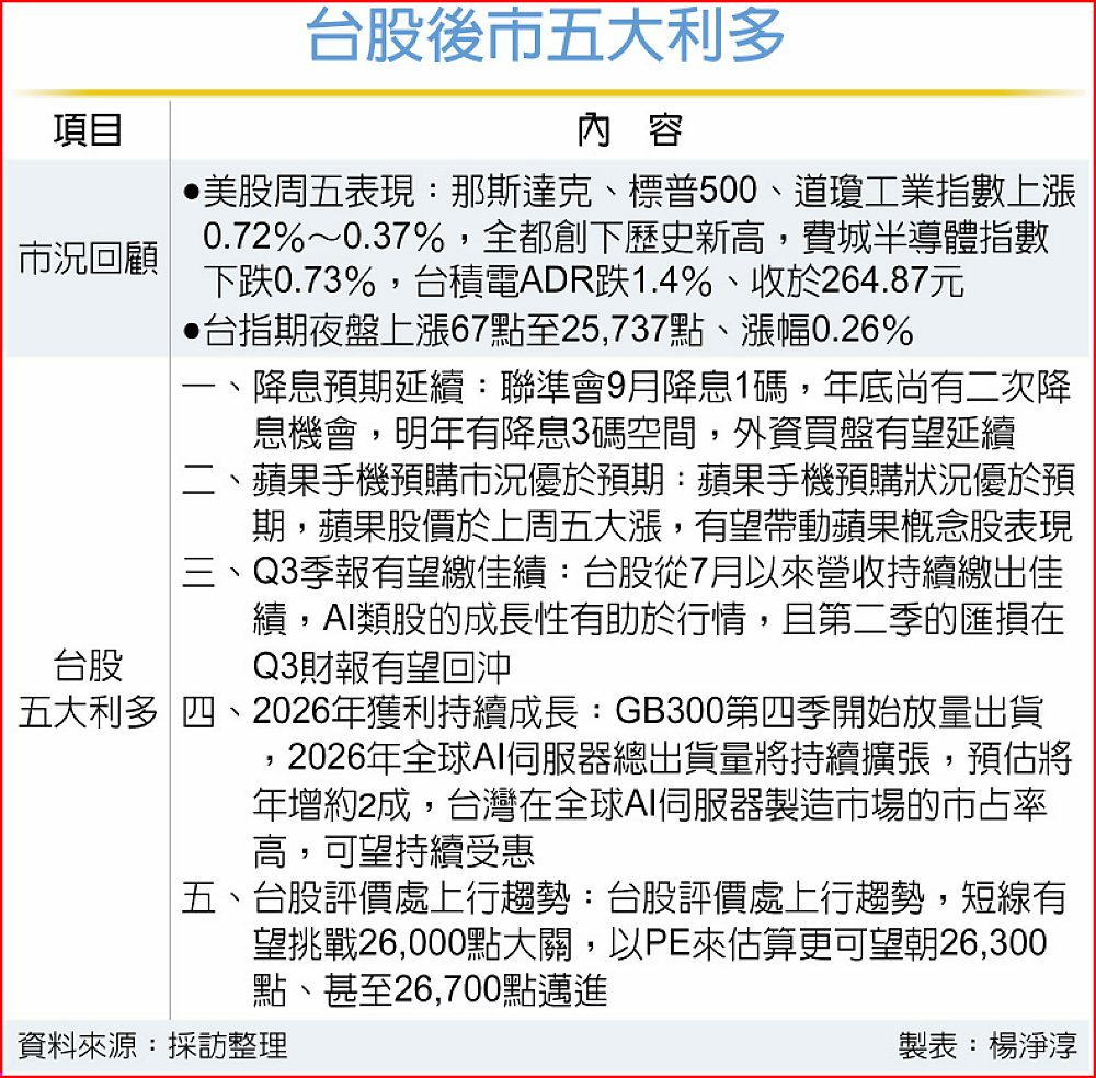美股三大指數19日齊創歷史新高,台指期夜盤也呈現反彈上漲67點至25,737點,法人表示,後市在降息預期延續、蘋果手機預購市況優於預期、季報有望繳佳績、2026年獲利持續成長、評價處上行趨勢等五大利多助攻之下,本周有望可挑戰26,000點、10月有望可挑戰26,300點,且第四季高點更有望上看26,700點。